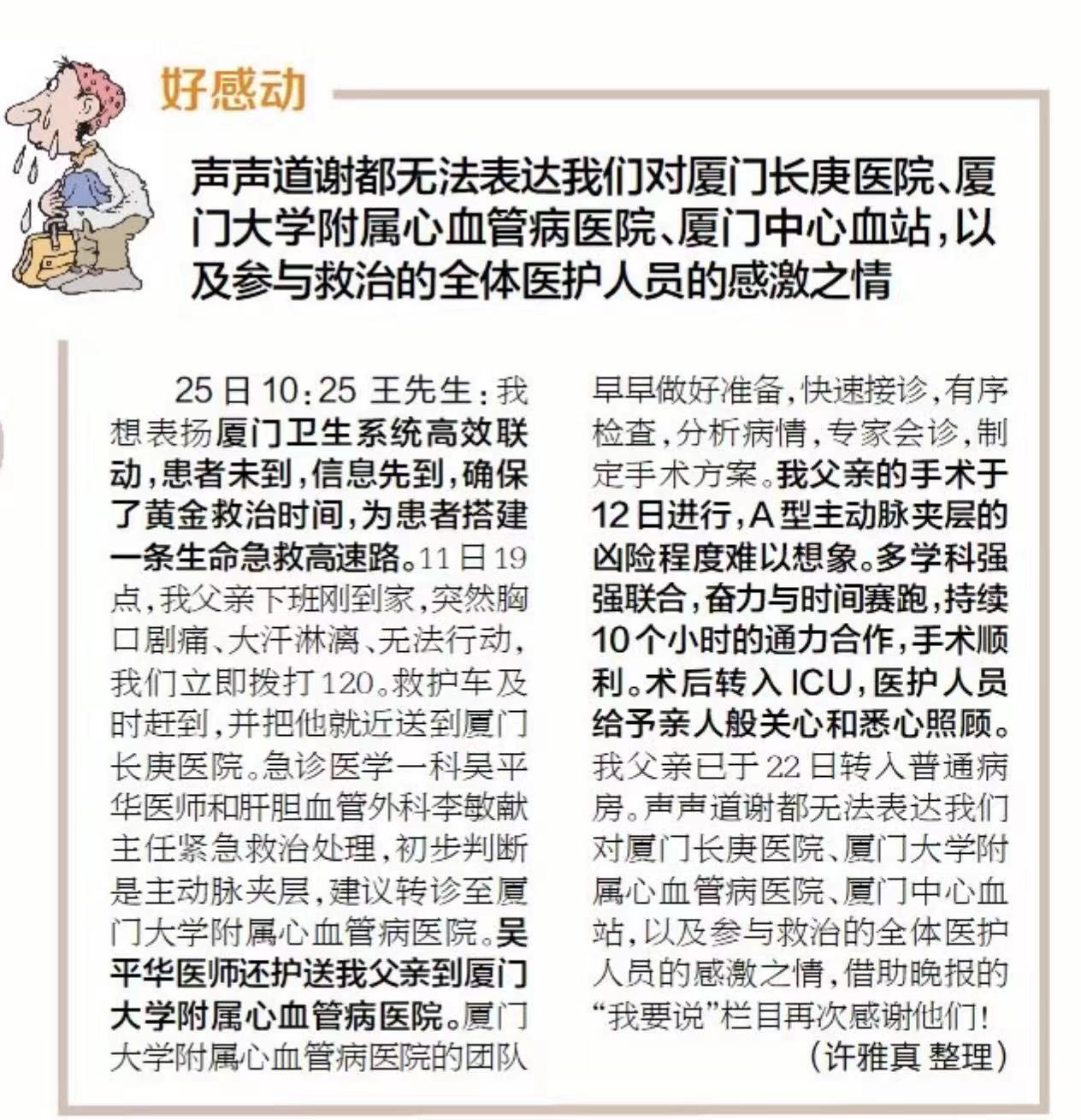 2024-04-30厦门晚报|声声道谢都无法表达我们对厦门长庚医院、主播福利 、厦门中心血站,以及参与救治的全体医护人员的感激之情 -